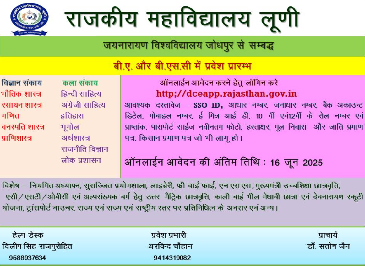 Welcome to the official site of Government College, Luni. The College established on March15, 2018. It is a co-educational institute fully financed by the Govt. of Rajasthan. The College is affiliated to the Jai Narain Vyas University, Jodhpur. The college provide Bachelor Degree courses in Arts and Science. In Arts the College offer seven subjects; History, Pub. Add, Geography, Economics, Political Scicence, Hindi Lit., English Lit. In Science stream Botany, Chemistry