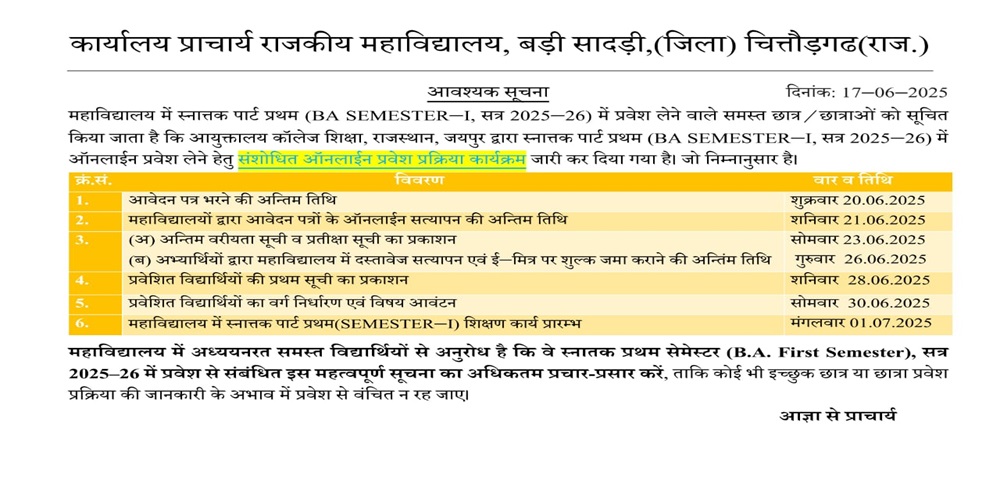 Welcome to Govt. College, Badi Sadri, Dist- Chittorgarh in the city of glory, bravery and proud. This is a newly established (2018) co- education college, presently running under graduate course in faculty of Arts. College offers seven optional subjects namely Economics, Geography, History, Political Science, Hindi Literature, English Literature and Sanskrit Literature in the Arts faculty for under graduate course.