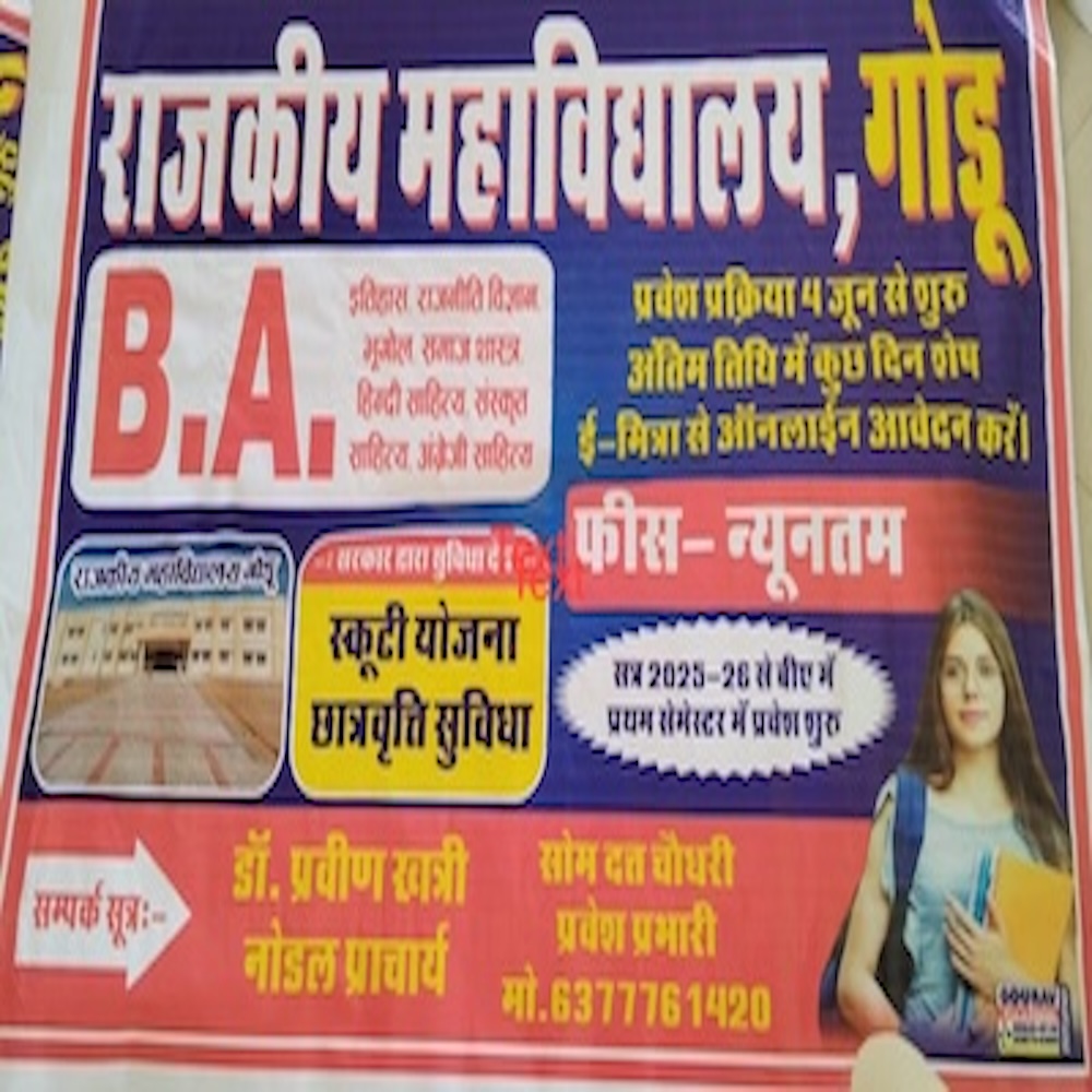 Government College Godu was established in 2023 by the Government of Rajasthan to offer quality higher education in the desert area. Godu is a desert village in western Rajasthan situated 125 km away from the district headquarters, Bikaner.