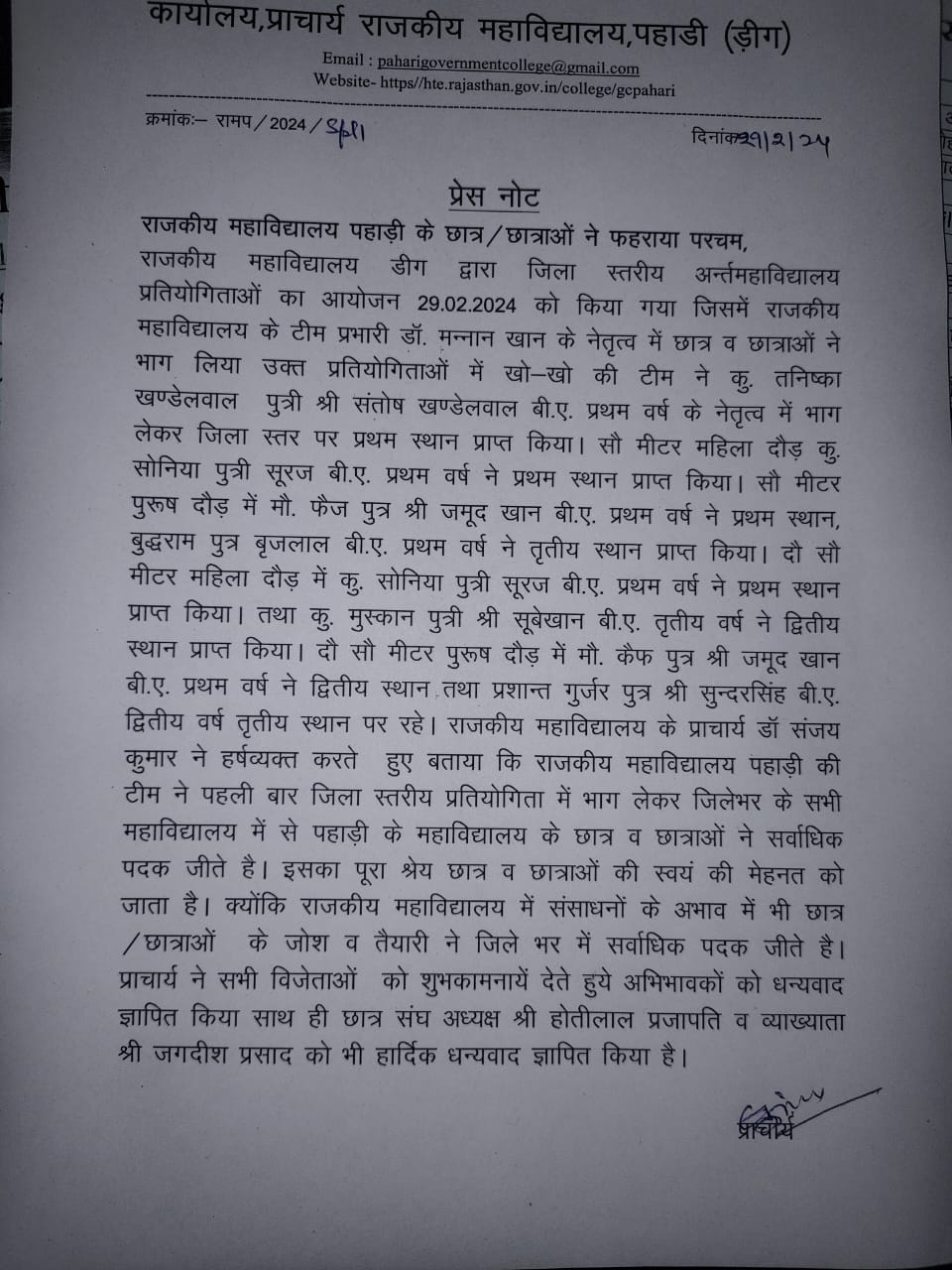 Government College, Pahari is located in the rural area of Deeg District of Rajasthan State. The College is affiliated to the Maharaja Surajmal Brij University , Bharatpur. Its academic calendar is in consonance with the University calendar. The College is established on August 2019. It is located 84 KM towards North from District head quarter Bharatpur .