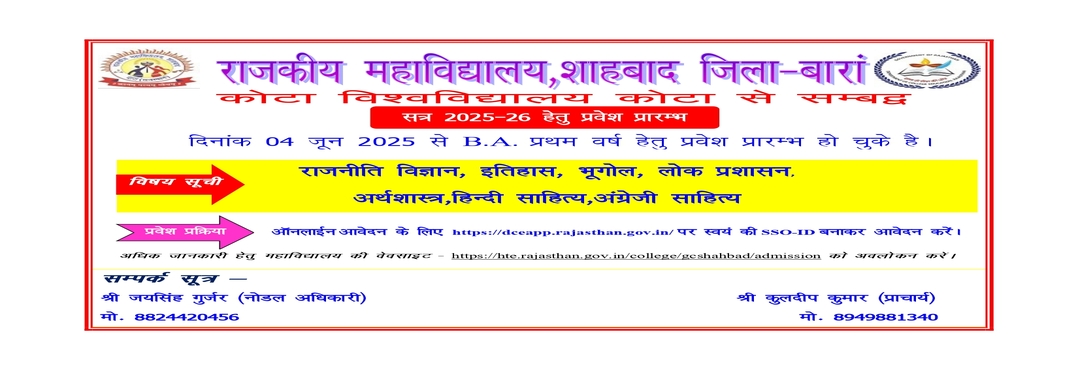 The city of shahbad is situated at the centre of the southeastern region of rajasthan. Shahbad was earlier part of kota state. Now is town in shahbad tehsil of baran district . Government college shahbad was established on 08th august 2019.College got affiliation from kota university ,kota . College offers graduation in 07 subjects.