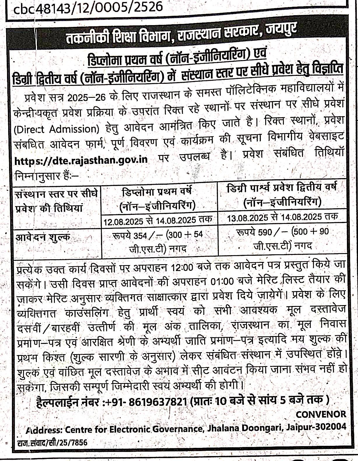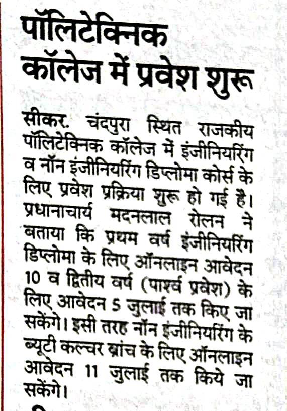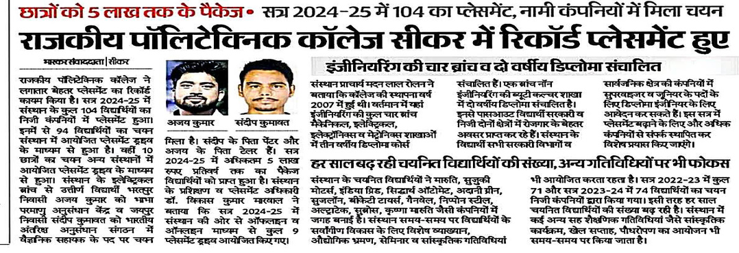 Government Polytechnic College, Sikar, established in 2006, is a distinguished institution located in the district headquarters of Sikar, Rajasthan. We are committed to delivering high-quality technical education that equips students with the skills necessary to thrive in today’s competitive job market. The college operates under the auspices of the Directorate of Technical Education (DTE) Jodhpur, ensuring ...